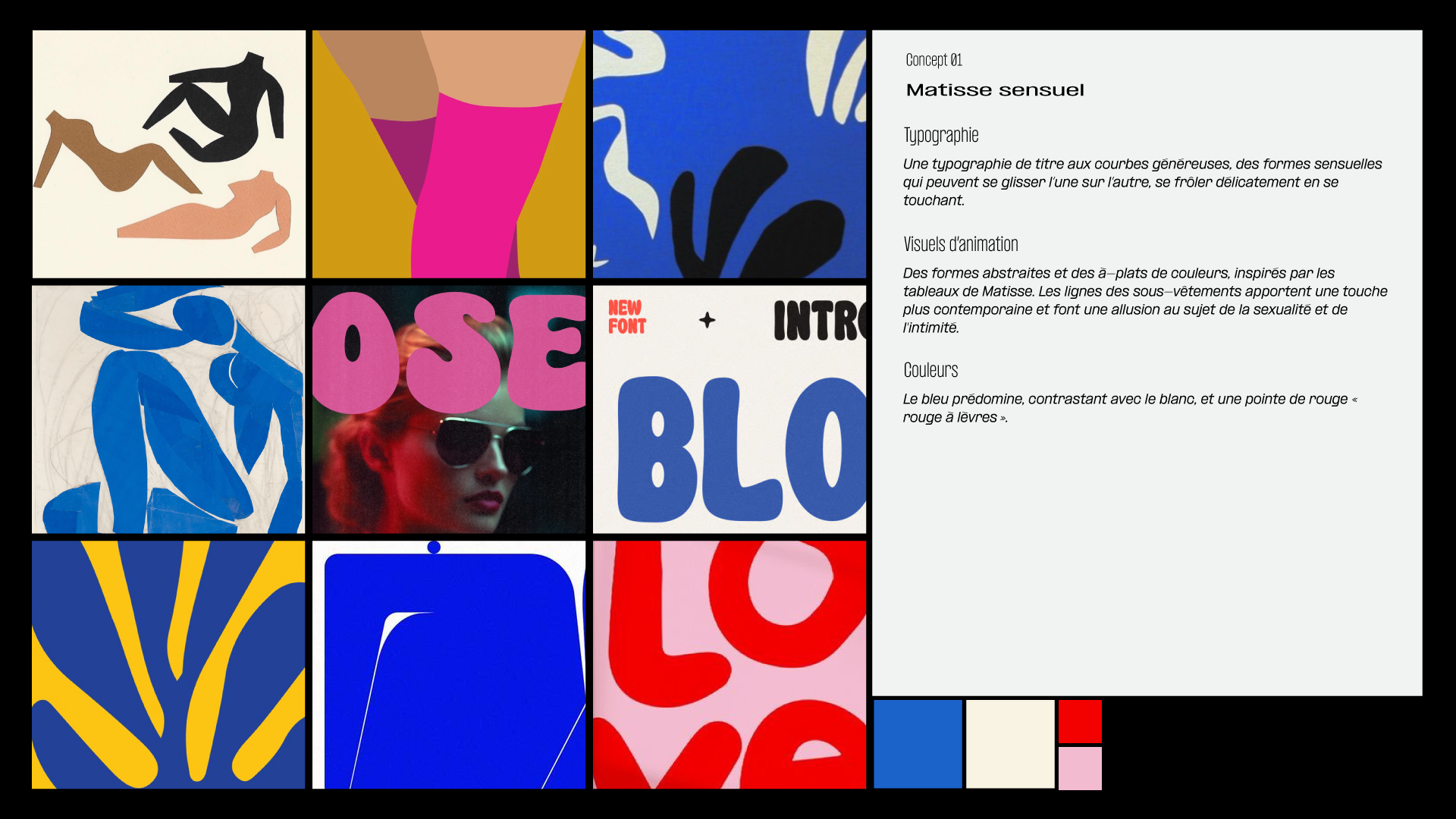 Dans une première phase de recherche, j’ai développé trois moodboards distincts, conçus comme des outils de discussion avec la réalisatrice Vanessa Boisset.