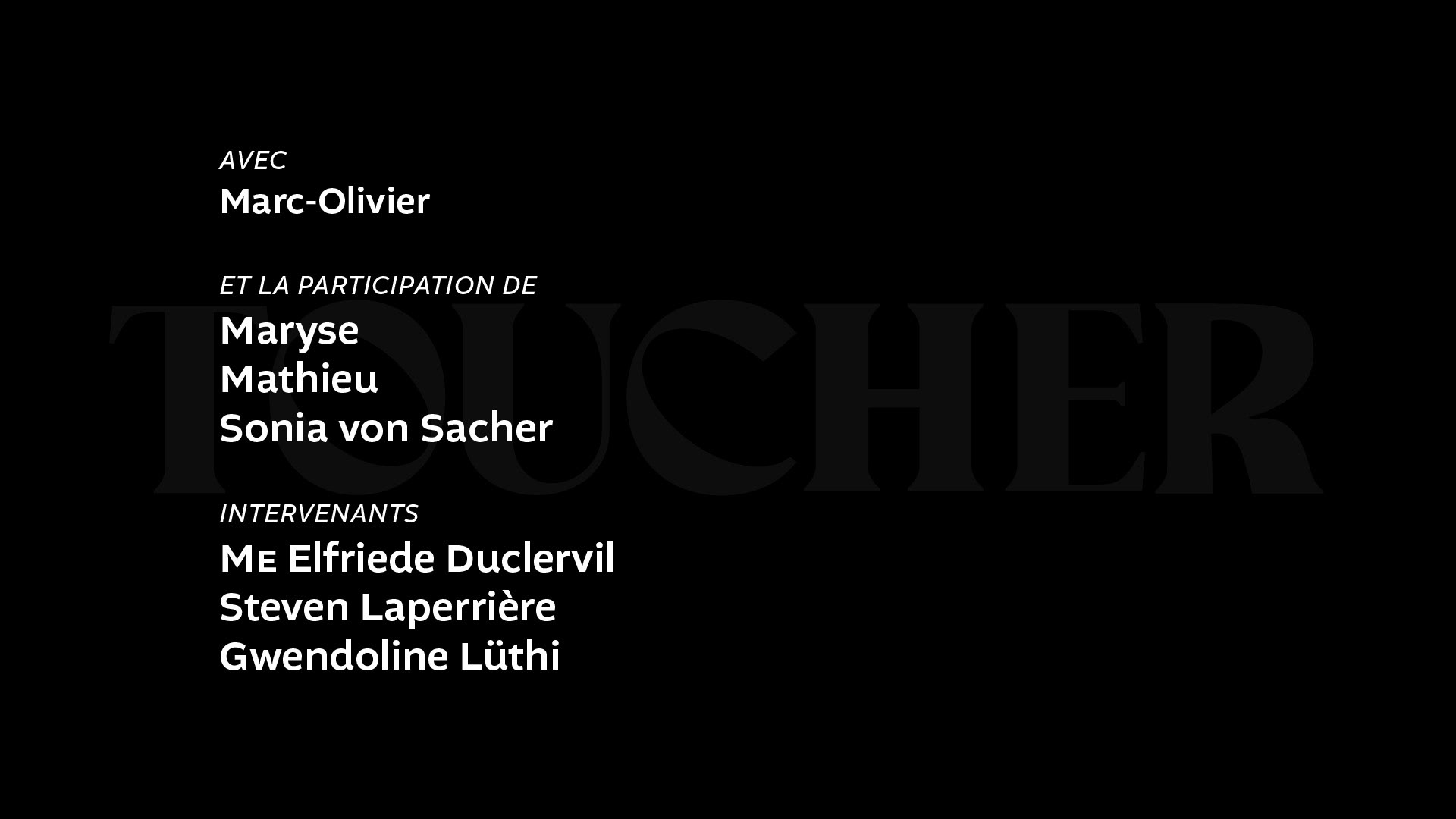 TOUCHER est une série documentaire de six épisodes réalisée par Vanessa Boisset et produite par Isabelle Gamelin et Ian Quenneville (Avanti-Toast), diffusée sur AMI-télé.